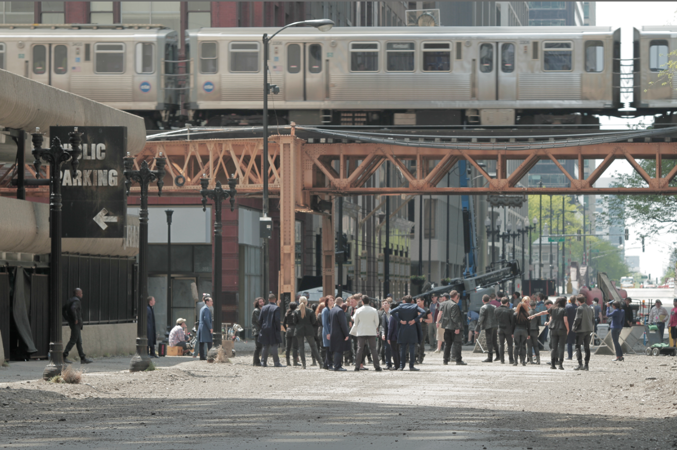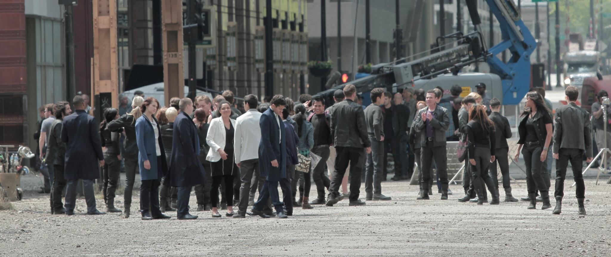 Hier Divergent se filmait dans le centre de Chicago, beaucoup de personnes ont donc pu prendre des vidéos et des photos de la scène qu'ils tournaient. Grâce aux vidéos je pense ne pas me tromper en affirmant qu'ils tournaient la scène juste après le Cérémonie du choix, où les Novices courent dans la ville pour rejoindre le siège des Audacieux. Sur l'une des vidéos, nous pouvons voir qu'ils montent sur la voix ferrée. (Je vous remets la vidéo que je vous avais postée hier).