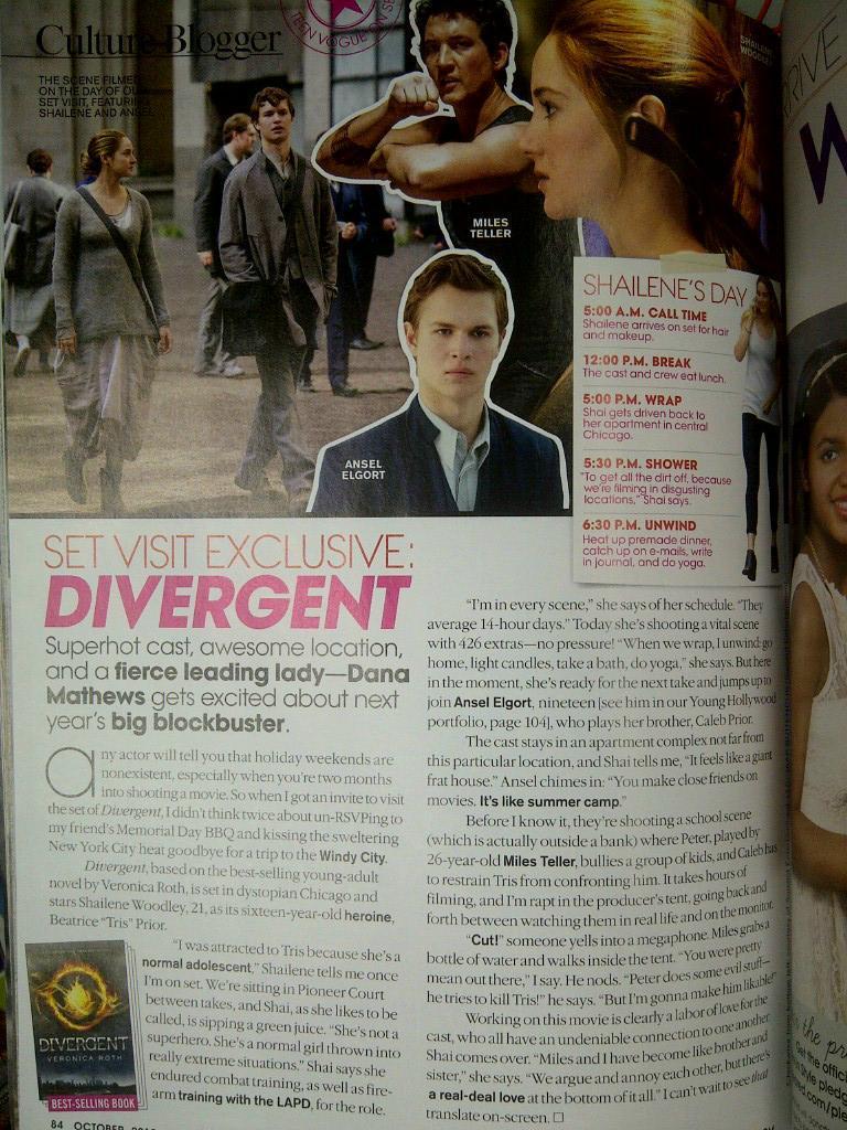 Voici les scans (enfin, photos..) du numéro d'octobre de Teen Vogue, avec un article sur Divergent, de nouvelles images (par exemple Caleb en érudit ! ) et un article sur Ansel Elgort dans la catégorie Young Hollywood. (Cliquez sur les images pour les agrandir.)