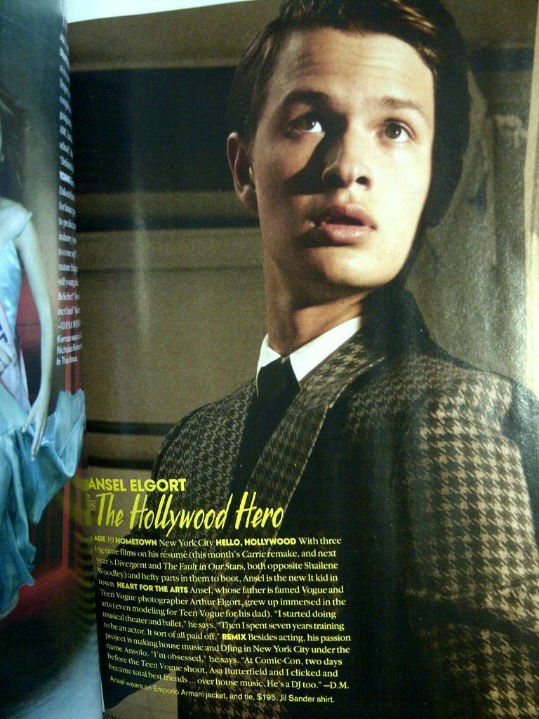 Avec trois gros film sur son CV (le remake de Carrie ce mois-ci, et l'année prochaine Divergent et Nos étoiles contraires, tous deux face à Shailene Woodley), trois énormes rôles pour commencer, Ansel est le nouvel enfant à la mode en ville. UN COEUR POUR LES ARTS Ansel, son père est le célèbre photographe de Vogue et de Teen Vogue Arthur Elgort, a grandi en immersion dans l'art (même le mannequinat pour Teen Vogue pour son père). "J'ai commencé à faire des comédies musicals et des ballets,"dit-il. "Puis j'ai passé sept ans à m'entraîner à devenir acteur. Tout ça a payé." REMIX En dehors de jouer, sa passion est de faire de la house music et d'être DJ dans NY sous le nom d'Ansolo. "Je suis obsédé, au Comic-con, deux jours avant le shoot de Teen Vogue, Asa Butterfiels (La Stratégie Ender) et moi nous sommes rencontrés et sommes totalement devenus meilleurs amis...avec la house music. Il est aussi DJ."